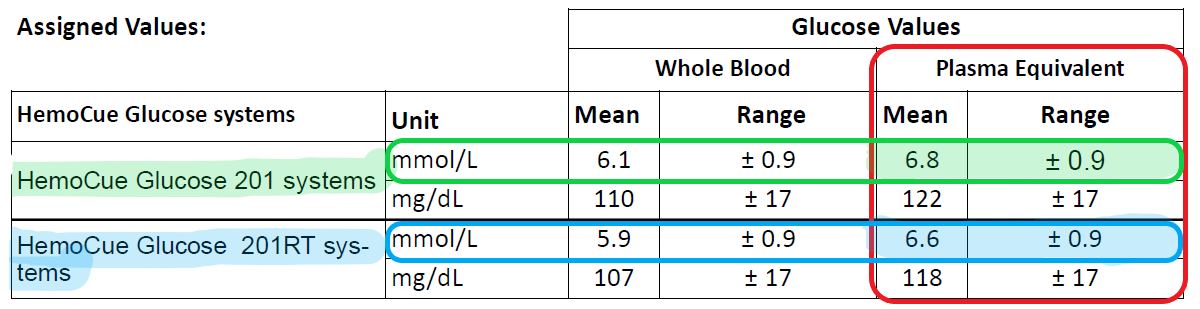 Under er eksemplet på Eurotrol GlucoTrol-NG, som er beregnet både på Glucose 201+ og Glucose 201 RT. I tillegg til å måtte velge riktig instrument, må man velge riktig enhet (i Norge mmol/L) og om resultatet er fra fullblod eller plasma. I Norge er det besluttet å gi ut glukose-verdier i plasma-ekvivalente verdier, selv om prøvematerialet er fullblod. HemoCue-instrumenter konverterer automatisk fullblod-verdier til plasma-verdier.